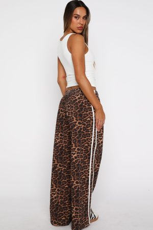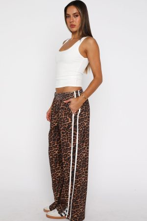 You asked we delivered! Introducing your newest fav pants. the Make Me Promises Pants in Exotic Spot. Designed with a thick elasticated waistband. pockets at side. unlined and relaxed fit. Finished with a double stripe detailing down the side for sporty vibe. Complete the look with a basic tank. sneakers and layered gold jewellery for a cool street style vibe.