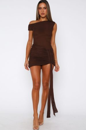 Glow up in the Make Them Jealous Mini Dress in Chocolate! Features a one shoulder neckline. fitted bodice. ruched detailing on skirt. drawstring tie on side front with sash elegantly falling to above floor length. Pair with clear heels are layered gold jewellery to be all anyone looks at!