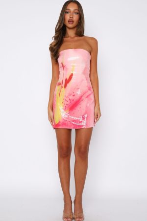 Take centre stage in the Make Up My Mind Mini Dress Blossom Petal. Features a strapless design with gel grip on bust. hidden back zipper and clasp. sequin embellishments. mini length and lined. We love this styled with kitten heels and your favourite gold accessories.