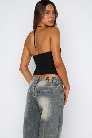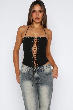 It’s all in the details! The Make You My Lover Bustier in Black features thin halter neck straps with self tie closure at back. square neckline with eyelet detailing. corsetry inspired lace up design centre front. paneling to structure the waist and back invisible zipper and clasp closure. Get girls night ready by pairing with jeans and heels!