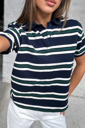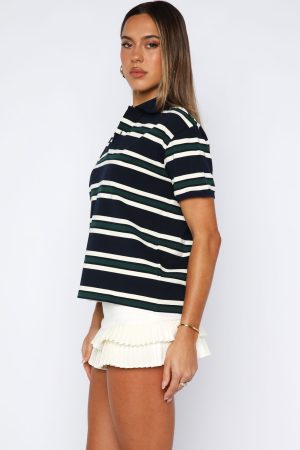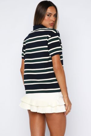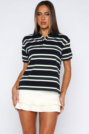 Nostalgia. served effortless in the Make Your Move Polo Tee in Navy Stripe. With its classic collar neckline and center‑front buttons. plus softly slouched short sleeves framed by ribbed elastic cuffs. this tee delivers vintage charm with modern ease. Style with your fav denim jeans. sunnies and layered gold jewellery!