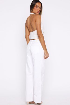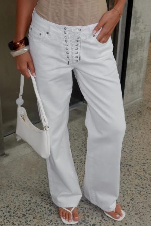 The Making Appearances Mid Rise Lace Up Straight Leg Jeans White is your new bold fashion statement! Featuring a front lace up closure design. 5 pocket detailing. mid rise. straight leg design and denim material. Pair with a white tank and your favourite sunglasses for a cool girl look!