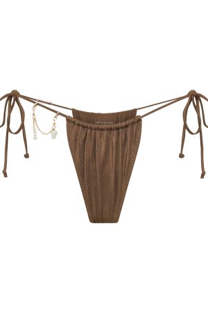 Your beach attire just got a whole lot hotter! The Mamaia Bottoms in Mocha feature a cheeky cut design. lined. tie up sides. adjustable ruching along front and back and front side embellishment . We love this paired with the matching Lagoon Coast Bikini Top and layered gold accessories!