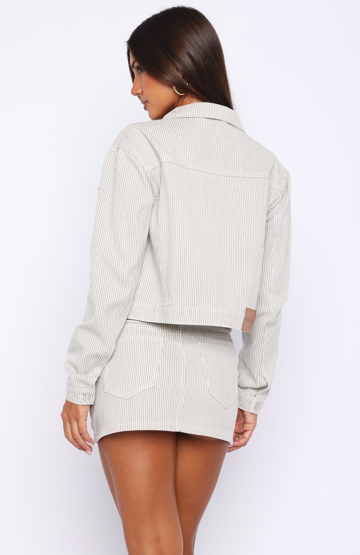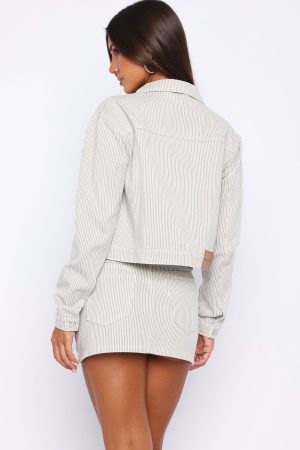 Set of the season! The Mariah Mid Rise Striped Denim Skirt in Grey/White features a button-and-zipper closure. belt loops. classic 5-pocket design. and an unlined denim fabrication with a chic stripe pattern. Style it with the matching jacket and kitten heels for a polished. coordinated look.