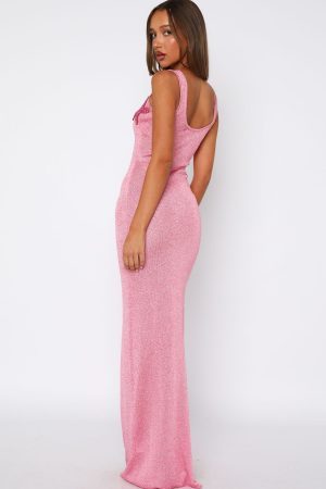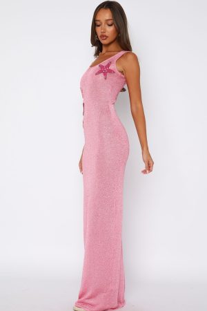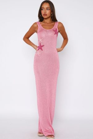 Classic silhouettes. dramatic details. The Marine Mist Sequin Knit Maxi Dress in Pink features thick shoulder straps. scoop neckline. attached beaded shell detailing on side front and stunning shimmer fleck fabrication. Wow all by pairing with clear heels and layered gold jewellery!