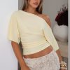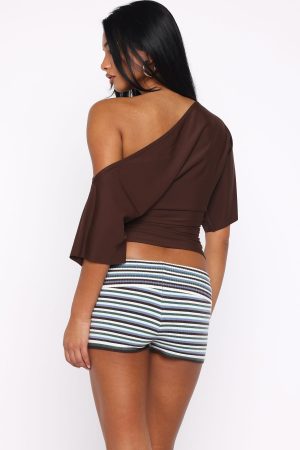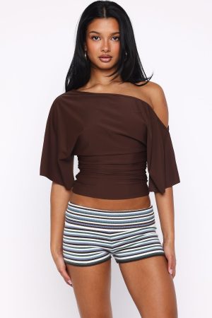 Feel effortlessly chic in the Marrakech Moments Top in Chocolate! This off-the-shoulder design features relaxed short sleeves and ruched detailing at the side. creating a flattering cinched waist. Unlined for a lightweight feel. it’s perfect for warm evenings. Pair it with mini shorts for a sultry. summery look that’s sure to turn heads.