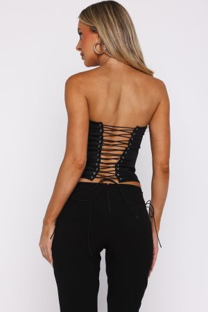 You in the Martini Hour Strapless Bustier in Black = a main character moment! Featuring a strapless design. faux boning at the bodice. invisible side zipper and a clasp closure. back lace-up corsetry-inspired closure and front beaded embellishments with a high shine finish. Style with low-rise jeans and a kitten heel for an understated. cool girl look!