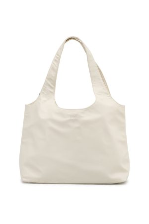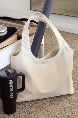 Sipping matcha. slaying Pilates calls for the Maxton Nylon Shoulder Bag Cream. A sleek shoulder bag with thick straps. small internal pocket and an oversized rectangular shape that keeps your essentials close and your look effortless.