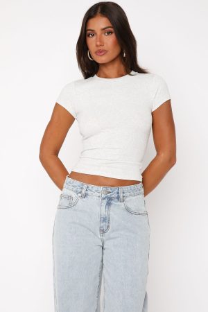 Casual never looked so good with the Meant To Tell Short Sleeve Baby Tee Grey Marle! Featuring a high cut neckline. short sleeves. figure hugging fit. cropped length and ribbed. stretch material. Pair with low rise jeans and gold jewellery for a simple. yet chic fit!