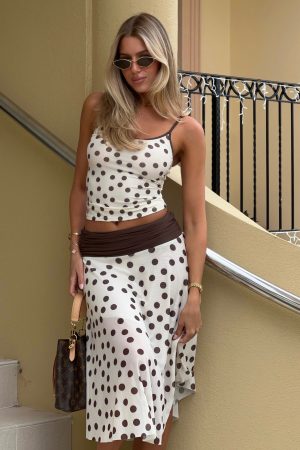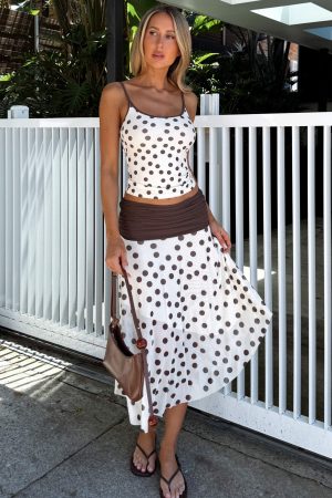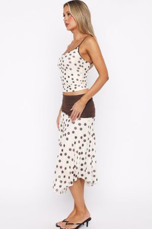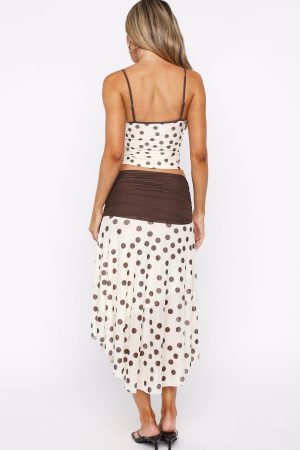 Float through your Summer in the Mediterranean Mirage Midi Skirt in Cream/Choc Polka Dot! Features ruching detailing on waistband. layered skirt. lined and stretch fabrication for an easy slip on and off. Complete the look with the matching Angel Love Top Cream/Choc Polka Dot and kitten for a wholesome fit.