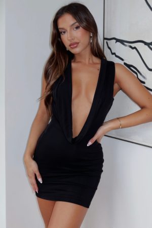 The Meet Me At The Bar Mini Dress Black is party perfection. Features a sexy. halter plunge neck. hugging fit and stretch fabric to keep you comfortable. Wear yours with mule heels and a sleek. high bun. We’re in love!