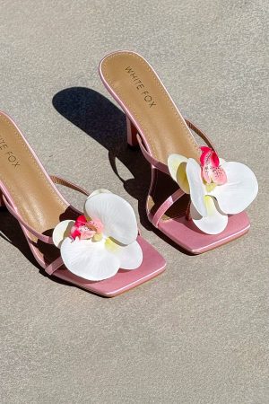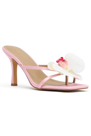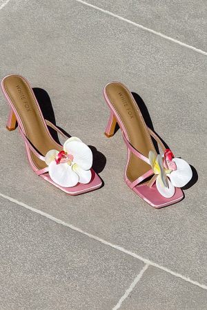 The Megan Mules in Pink Satin/White are the dreamiest heels! Featuring an open toe. square design. two toe strap design with floral detailing and rounded back. We are in love!