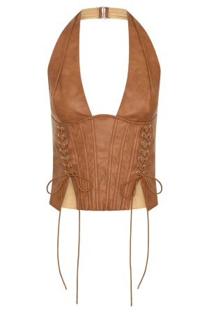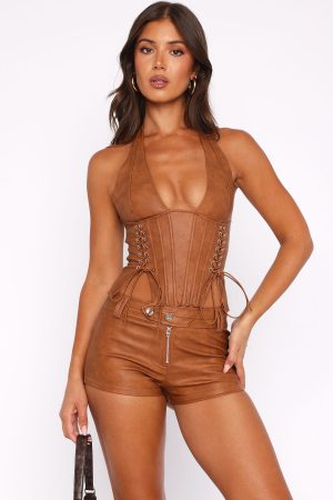 Let this bustier be your go-to for fun! The Midnight Blues Pu Bustier Tan features a halter neck design with back hook and clasp closure. ultra low plunge neckline. boning in bodice. front lace up detailing. back zipper and clasp closure. unlined and gorgeous PU fabrication. Pair with the matching Midnight Blues PU Booty Shorts and knee high boots for a killer look!