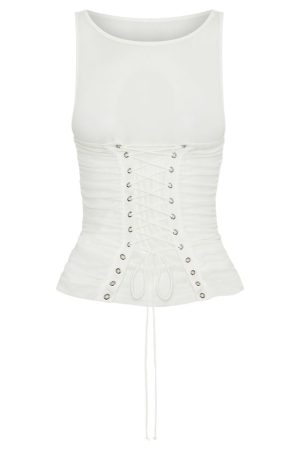 The Midnight Drive Top Off White is the perfect desert coded fit! Features a high cut neckline with thick shoulder straps and sheer mesh material. cropped length. centre front lace up design and stretch material for an easy slip on design. Slay your look with the The Old Days Pleated Mini Skirt White and a chunky belt.