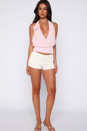 Being hot takes no days off. The Midnight Riffs Crochet Top Baby Pink features thin self-tie halter straps for an adjustable fit. a plunging neckline. and soft knit fabrication for lightweight comfort. Accented with an attached floral detail on the bust. an open back. and a ribbed hem. Style with a mini skirt for the cutest look!