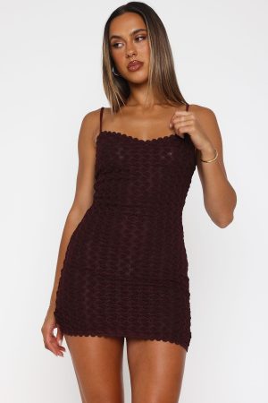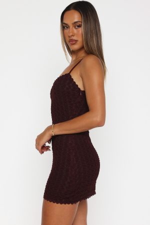 Fall in love in the Midnight Snack Mini Dress Wine. Features thin adjustable straps. scallop trim hemline detail. mesh fabric. hidden side zipper with hook & eye. semi-sheer finish. mini length and a gorgeous textured fabric. Keep it romantic and pair with gold accessories and a kitten heel!