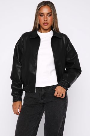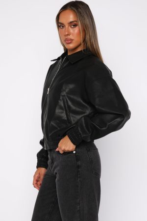 Make way for the hottest jacket of the season! Might Cause Trouble Pu Bomber Jacket Black features a collard neckline. front zipper closure. two front faux pockets. elasticated hem and cuffs. lined and oversized fit.