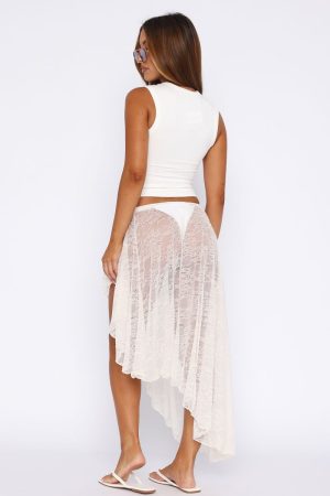 A vacation must-have. the Milan Mornings Lace Maxi Skirt in Off White. Features elasticated waistband. asymmetrical design and lace pattern. Complete the look with your favourite White fox bikini. sunglasses and sandals for a look we love!