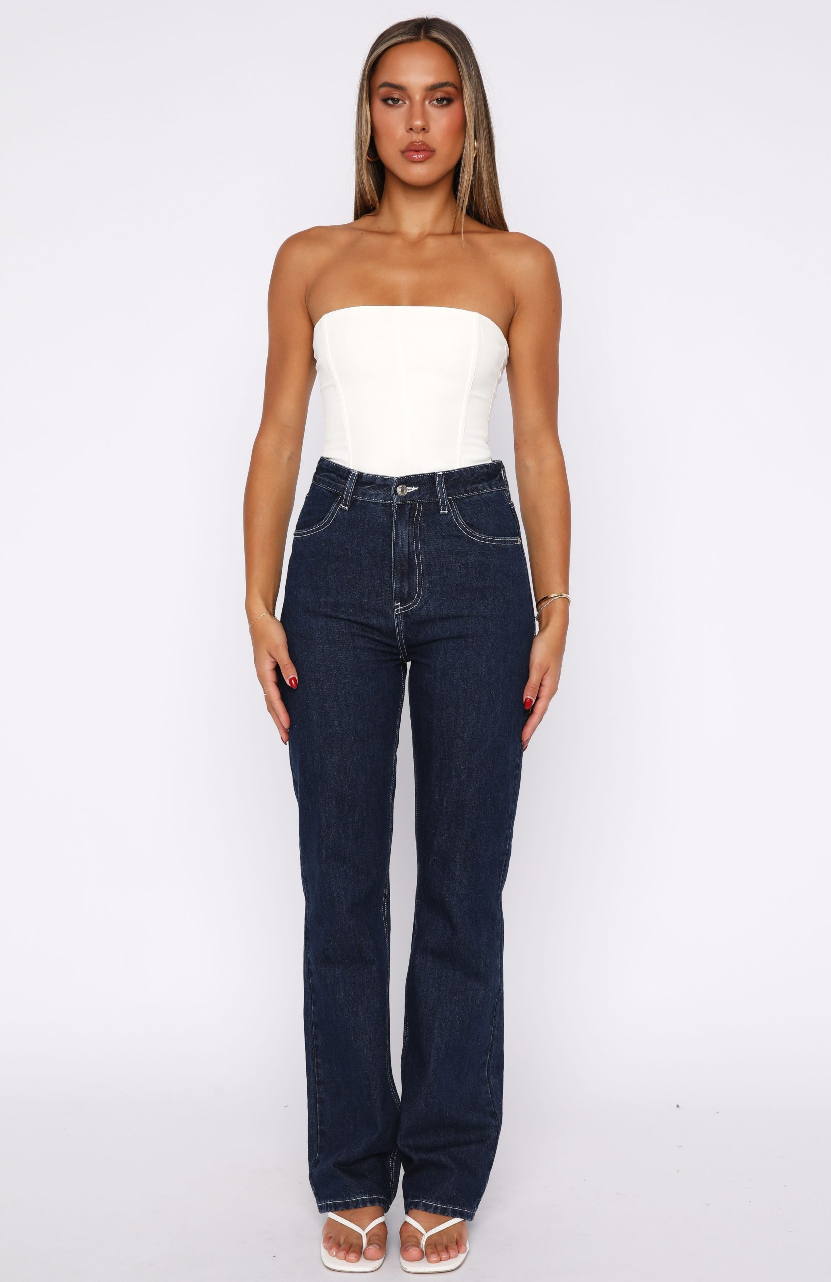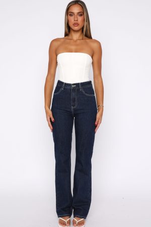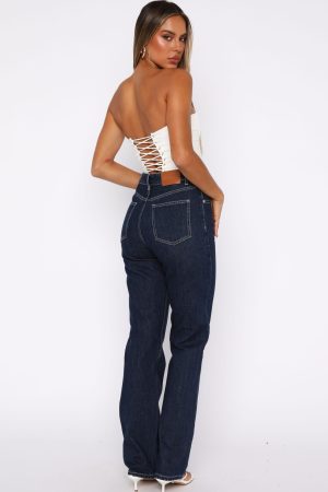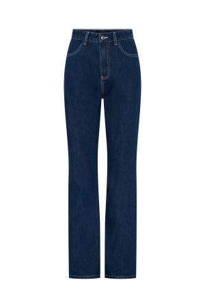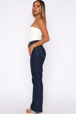 The Millie High Rise Bootleg Jeans Dark Indigo is designed to elevate any look. Features a straight leg style. high waisted with silver button closure & zip at front. belt loops. 4 pocket design. WF logo on back and are full length. Style with a blazer and kitten heels for the ultimate boss babe look!