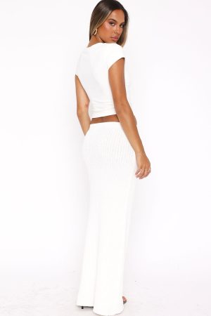 Let this skirt transport you to a tropical paradise! The Millionaire Knit Maxi Skirt White features a thick elasticated waistband. maxi length. unlined. knitted fabric and stretch material for an easy slip on design. Complete your beach getaway fit with a white tank and sandals!