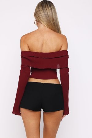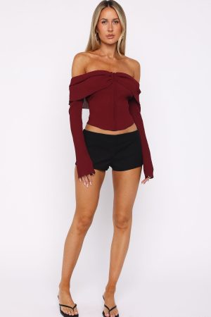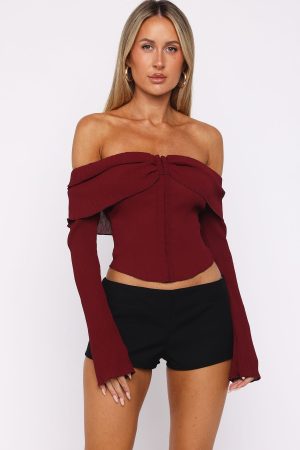 Chic by day. dazzling by night. The Mood Forever Long Sleeve Off Shoulder Top Burgundy features an elegant off‑the‑shoulder neckline with a fold‑over bust detail. long sleeves. and a fitted bodice with a sleek hook‑and‑eye centre‑front closure. Crafted in a subtle ribbed fabrication and left unlined. Style it with your favourite denim for everyday polish. then elevate with heels and layered gold jewellery for after‑hours glamour.