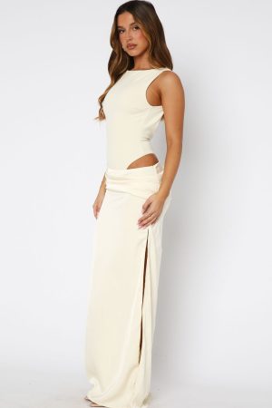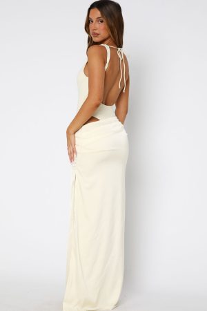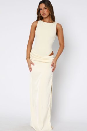 The aesthetic is glam! The Moonlight Muse Maxi Dress in Lemon features a high cut neckline with adjustable. back self tie strap. cut out design at hip. ruched detailing. side zipper and clasp closure on skirt. high side split detailing and maxi length. Add layered jewellery for a night worth celebrating!