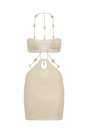 It’s viral for a reason! Meet the Moonlit Muse Mini Dress in Pearl! This mini length silhouette features a chain halter neckline adorned with chunky beadwork which can be worn straight or crossed at the front. Designed with integrated grip tape at bust. and purposeful cut-out at the waist framed with coordinating chains and beads. Crafted from a high‑stretch. lined fabric. it’s elegantly backless. Finish the look by making those heels speak and let your layered jewels do the talking.