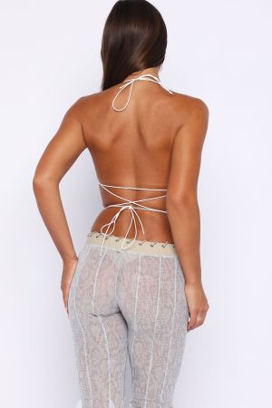 Outfit first. line up second. The More Dreams Halter Top White features self-tie elastic halter straps and a bold plunge neckline. Sheer fabrication sets the stage for embroidered floral detailing scattered with rhinestones. Finished with a backless design and criss-cross self-tie straps. Style with In Your Glow Pants and get ready for festival nights.