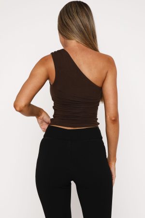 Add a touch of fun to your beach vacation outfit! The More Life One Shoulder Top Chocolate features a one shoulder design with beaded detailing. cropped length. side ruching detailing and buttery soft. stretch material for an easy slip on design. Style with a mini skirt and layered gold jewellery to show off your glow!