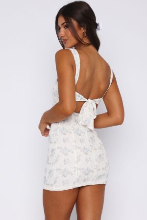 No double faults are made in the More Than Enough Mini Dress in Sky Ditsy! Features thick shoulder straps. sweetheart neckline with ruched bust detailing. backless with adjustable self ties and lined.
