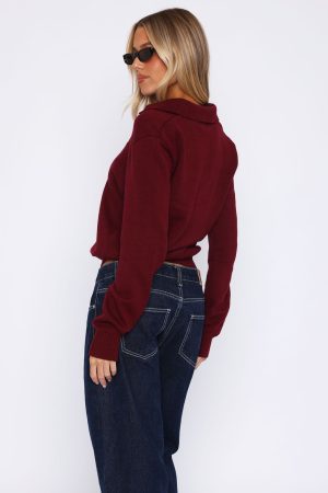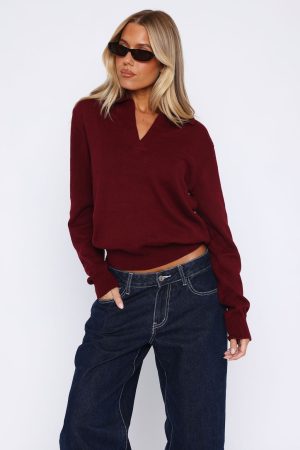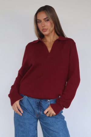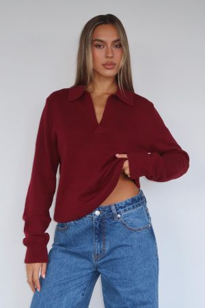 Feel posh in the Must Be You Knitted Polo Sweater in Burgundy! Features a collar and v-neckline. long sleeve with ribbed cuffs and cuffed hemline for a structured waistline. For a timeless look pair with White Fox denim jeans and sunnies for a warm winters day fit!