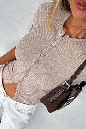 Latte tones are our new autumn obsession! The Mutual Feelings Ribbed Top Oat features short sleeves. a high-cut neckline with centre front button down closure. cropped length and unlined. stretch material for an easy slip on design.