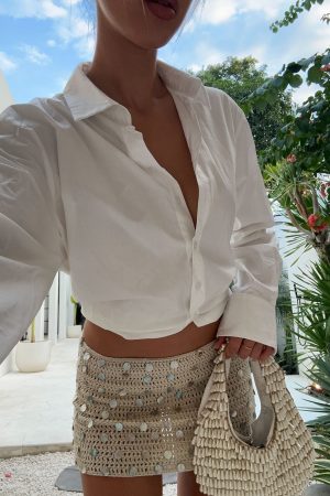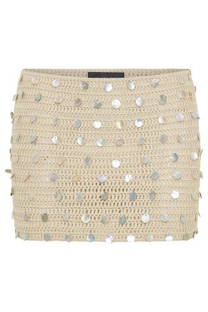 Long lunch attire. The My Nirvana Crochet Mini Skirt Shell features a thin elasticated waistband. crotchet material that is unlined and slightly sheer. mini length. high shine shell detailing. and stretch material for an easy slip on design. Pair with the matching Hidden Treasure Crochet Bikini Top Shell for the cutest matching moment!