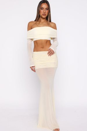 Check out the Need Your Heart Maxi Skirt Cream. now on our New Arrivals page! Designed with a thoughtfully placed double layered waistband. sheer maxi length. and delicate lettuce hem detailing. this high stretch. mesh fabrication is equal parts effortless and sweet. Style with the matching Need Your Heart Off Shoulder Top and heels for a look we love.