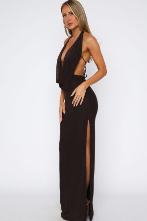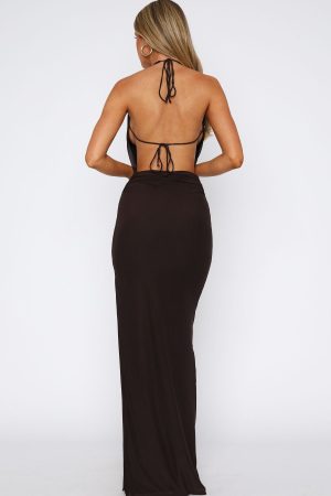 Steal the show in the Neither One Of Us Maxi Dress in Chocolate. Featuring a halter neck design with self tie. ultra plunge cowl neckline. maxi length. side split design. backless with self tie strap. mesh lined. figure hugging fit and stretch material for an easy slip on design. Style with perspex heels and a black shoulder bag to let the dress do all the talking!