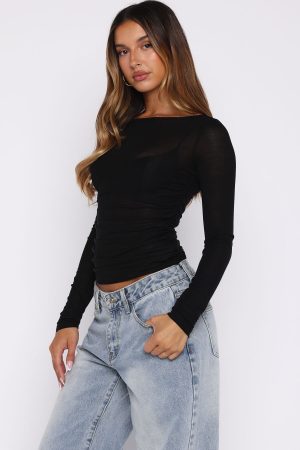 Tailored to perfection and just for you! The Never Took Me Serious Long Sleeve Top in Black features a scoop neckline. long sleeves. and side ruching. all on lightweight high‑stretch fabric for the perfect fit. Style with low rise jeans and a statement belt for a look worthy of stares!
