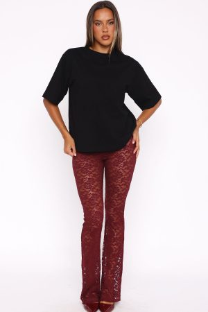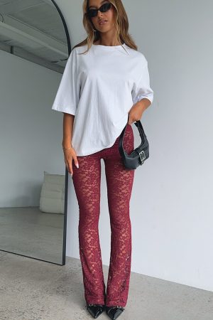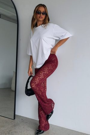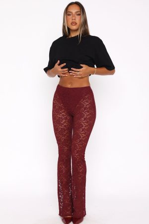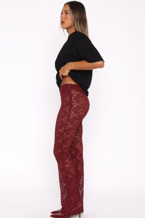 Keep it playful in the New Era Lace Pants Wine. Features sheer. lace fabric. sew-in hot pants. flared leg. thin elasticated waist band and mid-rise fit. Pair with an oversized tee for a chic look we are loving!