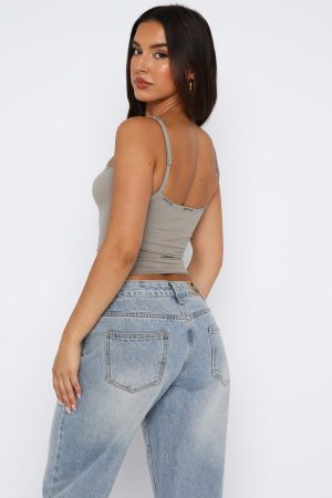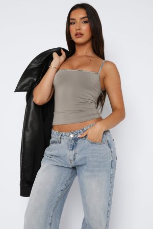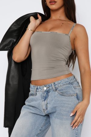 The new best part of your daily ritual: slipping on the New Expression Tank Smoke. Features thin adjustable straps. supersoft cotton jersey fabric. cropped length. White Fox logo printed on hemline and unlined fabric. Your new go to basic!