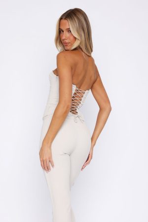 Every girl needs a staple bustier and the Next Chapter Strapless Bustier in Bone meets the brief. Features strapless neckline. bust cups with boning. boning in bodice. side zipper with hook and eye closure and adjustable lace up back design. Complete the look with matching Next Chapter Pants White.