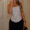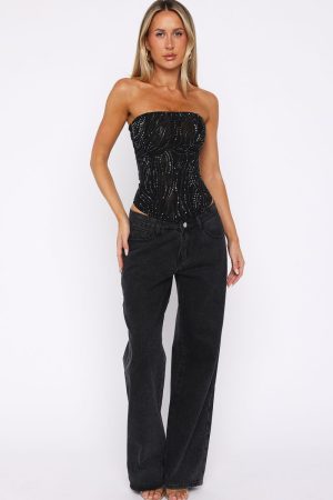 Your next remember‑this‑night outfit has arrived! The Night Bloom Embellished Bustier in Black. features a secure strapless neckline with grip tape. structured internal boning down the bodice for a flawless fit. and sparkling diamanté embellishments. A corset‑inspired lace‑up back and side zipper with hook‑and‑eye closure ensure the perfect shape. while the fully lined design keeps you comfortable all night. Style with your go-to denim jeans and kitten heels for all eyes on you.