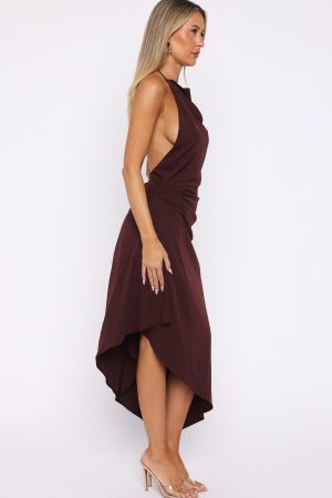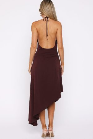 Be Santa’s cutest helper in the Night Hustle Halter Midi Dress Burgundy! Features halter straps. a high neckline that balances its daring backless silhouette. and flattering ruching at the hips. The asymmetrical hemline adds modern flair. while a side zipper with hook-and-eye closure ensures a seamless finish. Fully lined for comfort. Style with simple heels and you are ready for festive magic.