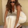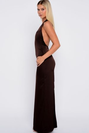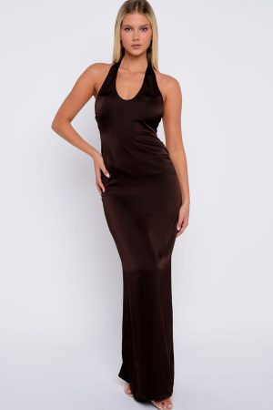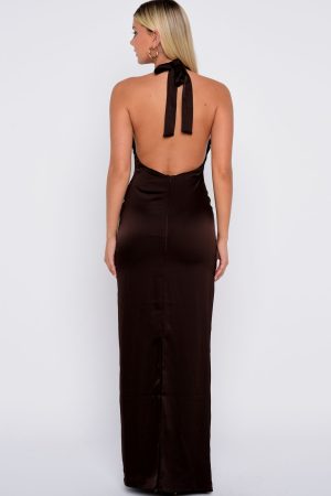 The Night-Time Madness Halter Maxi Dress in Chocolate is the perfect blend of effortless and sultry. Features thick halter straps. a flattering scoop neckline. and a floor-skimming silhouette with a chic back leg split. Fully lined and backless. it fastens elegantly with an invisible zipper and discreet hook-and‑eye closure—your go-to for understated. all‑night glamour. Style with simple gold jewellery. heels and a beautiful Baddest tan!