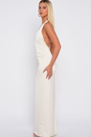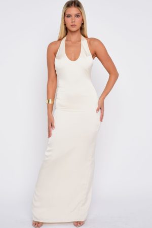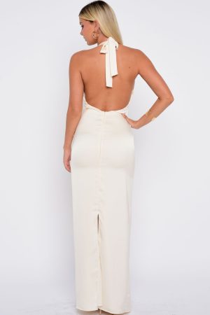 The Night-Time Madness Halter Maxi Dress in Oyster is the perfect blend of effortless and sultry. Features thick halter straps. a flattering scoop neckline. and a floor-skimming silhouette with a chic back leg split. Fully lined and backless. it fastens elegantly with an invisible zipper and discreet hook-and‑eye closure. Style with heels. simple gold jewellery and a beautiful Baddest tan.