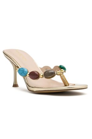 The ultimate summer shoes have just landed – welcome the Nina Mules in Metallic Gold! Features open round toe. two straps with beaded detailing. round back heel and kitten heel hight. These shoes dress up any fit and how could they not with those stunning beads.