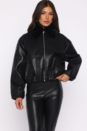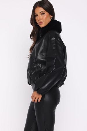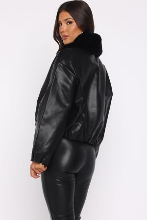 Exude boss girl energy in the No Competition Pu Bomber Jacket in Black! Features a detachable fur collar neckline. slouched shoulders. long sleeves with elasticated cuffs. zipper closure centre front. side pockets. and elasticated hemline for a cinched waist. All eyes are on you when styled with mini shorts. boots. and sunnies for a cool concert fit.