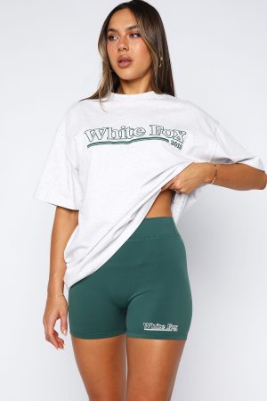 Rock up to class looking cute and comfy! Our No Hesitation Bike Shorts in Green features a thick waistband. puff print White Fox text at the side front. unlined. high stretch and buttery soft fabrication for all day comfort. Pair with matching No Hesitation Oversized Tee or No Hesitation Oversized Sweater.