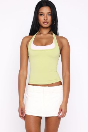 Elevating the layered trend! No Proof Double Layer Halter Top Green/Pink features fixed halter straps. a faux layered design. a scoop neckline. and a fitted silhouette. Crafted from high-stretch. unlined fabric with an open back. it offers a flattering fit. Pair with your favourite mini skirt. simple heels. and layered jewellery for a laid-back yet elevated look.