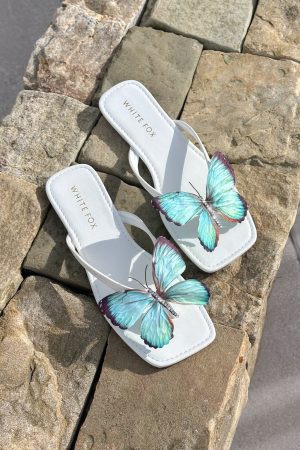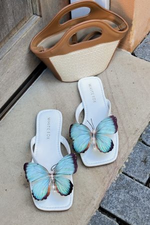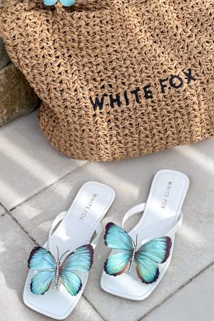The IT girl shoes of the season have just arrived – welcome the Noelle Sandals White/Aqua! Features square toe. 2 toe strap design with floral detailing. flat sole and rounded back- we are in love!
