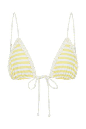 Level up your swimwear game. now cuter than ever with the Noosa Bikini Top in Lemoncello Stripe! This triangle bikini top has thin adjustable straps. adjustable front tie and frill detailing. To complete the look pair with the Coogee Bottoms in Lemoncello Stripe.