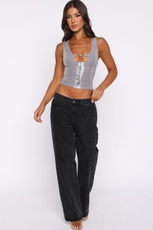 Make a memory‑making entrance in the Nostalgic Nights Sequin Top in Smoke! With thick straps. a round neckline and sweet key‑hole detail tied by a delicate necktie. this lined sparkle fabrication piece is all about shimmering elegance. Wear it with a denim jeans. kitten heels and layered gold jewellery for the perfect night out fit!